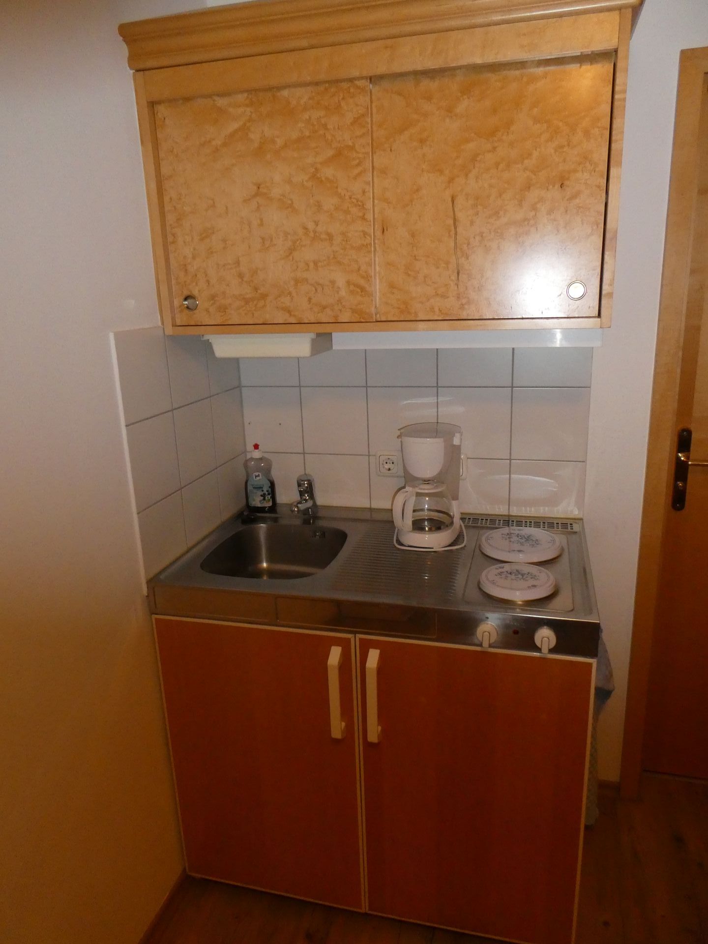 - kleine Küchenzeile mit Kaffeemaschine, Toaster, Wasserkocher, Eierkocher, Herdplatten und Kühlschrank