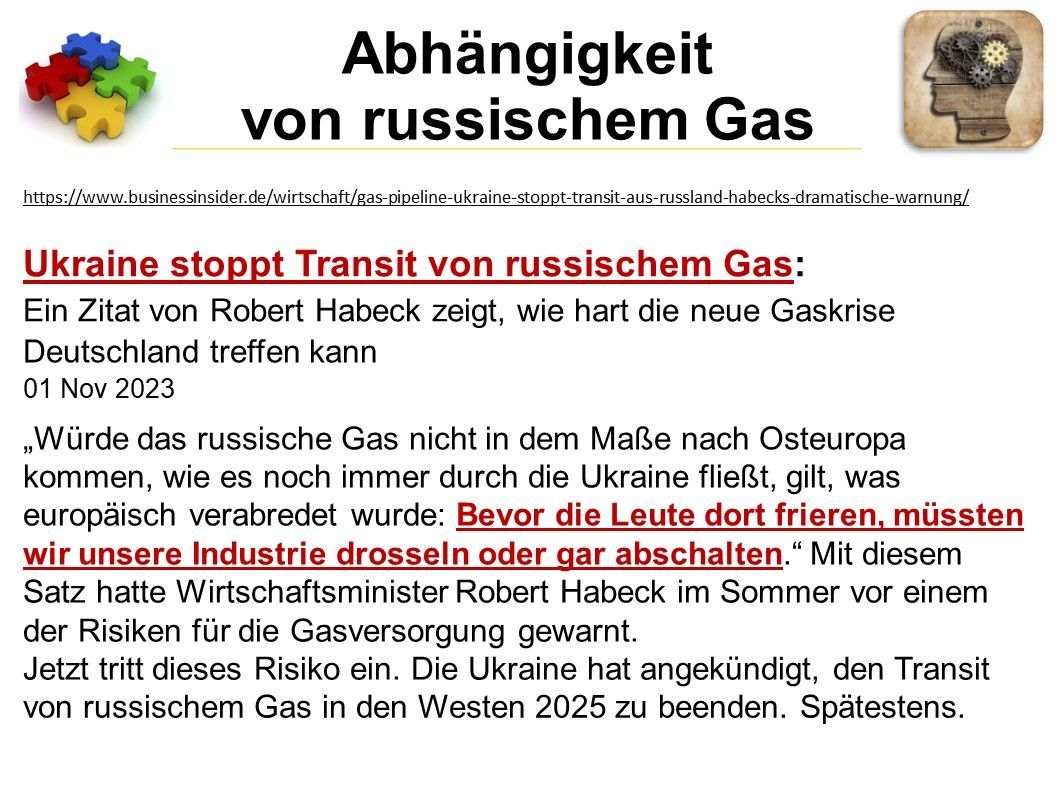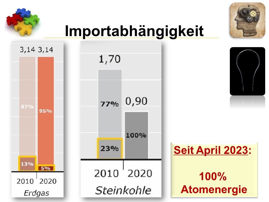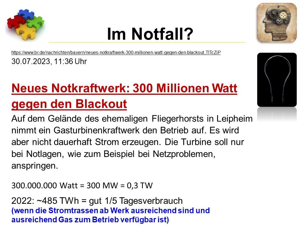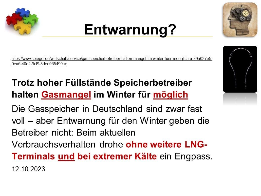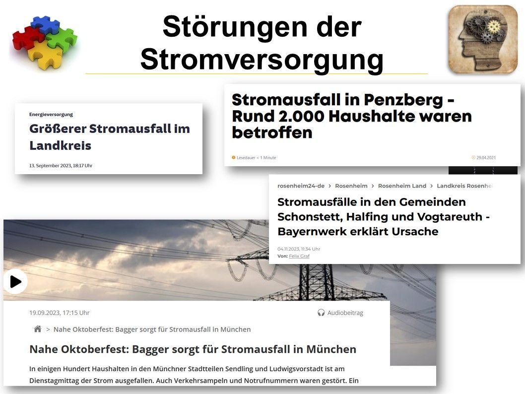 Wie hat sich denn unsere Energieversorgung weiterentwickelt? Daran kann man möglicherweise ablesen, ob eine „Entwarnung“ angebracht und zweckmäßig ist. Was ist 2023 geschehen? Im April wurden die letzten 3 in Betrieb befindlichen Atomkraftwerke vom Netz genommen, die bislang einen Teil der Grundlast unseres Stromnetzes garantierten. Seit April sind wir, die Bundesrepublik Deutschland, vom Netto-Stromexporteur zum Netto-Stromimporteur geworden – und diese Umkehr bestätigt sich zumindest bis einschließlich November. Durch die Abschaltung der Atomkraftwerke und den Ausbau erneuerbarer Energien ist unser Stromnetz anfälliger geworden, d.h. dass die Anzahl der Eingriffe zur Regulierung des Stromnetzes (sogenanntes Redispatching) auf die erforderliche Netzfrequenz von möglichst exakt 50 Hertz mit dem Anteil an erneuerbaren Energien steigt, die ins Netz eingespeist werden. Es gibt unverändert keine Stromspeicher, die bei einer Dunkelflaute (kaum Sonnenlicht plus nahezu Windstille – in Folge nur ein geringer Bruchteil der üblichen Stromversorgung mittels erneuerbarer Energien) über mehrere Tage die Stromversorgung ohne immense zusätzliche Importe gewährleisten könnten. Der Bundeswirtschaftsminister plant noch immer die vorhandenen Kohlekraftwerke 2024 vom Netz zu nehmen. Selbst zu 100% gefüllte Gasspeicher könnten den Bedarf von Wirtschaft und Haushalten nur zu rund einem Viertel und über maximal 2 Monate decken. Die Ukraine plant den Transit von russischem Gas durch die Ukraine nach Südosteuropa mit dem Auslaufen entsprechender Verträge zu stoppen. Beschädigungen von Versorgungsinfrastruktur, wie die der finnisch-estnischen Gaspipeline, können, ebenso wie ein strenger Winter, auf den wir keinen Einfluss haben, zu deutlichen Versorgungsengpässen führen. (Anm.: alle Quellenangaben auf der Internetseite www.happy-in.bayern/resilienz-in-krisen - diese Seite)