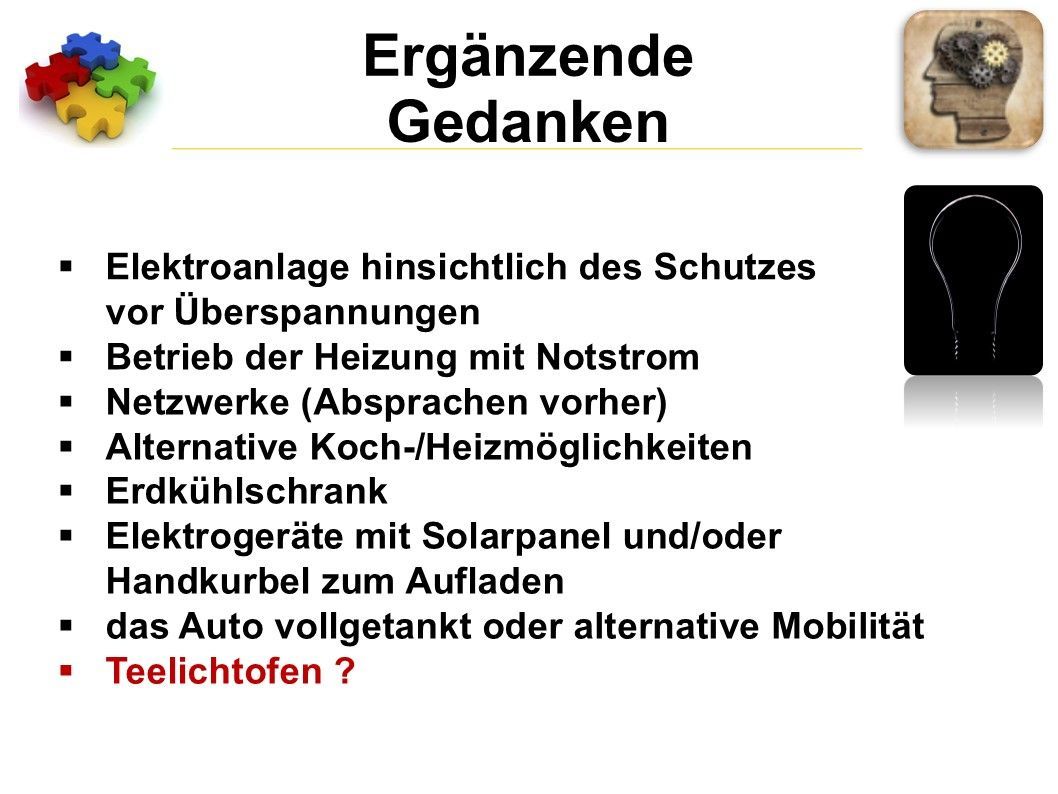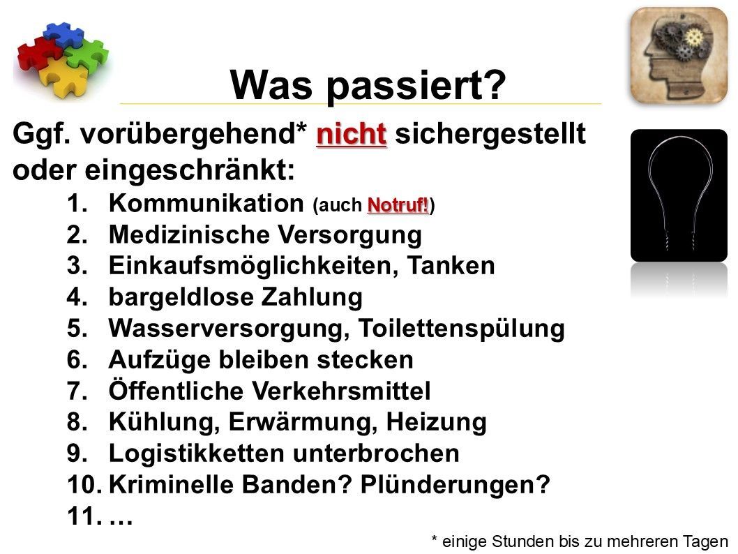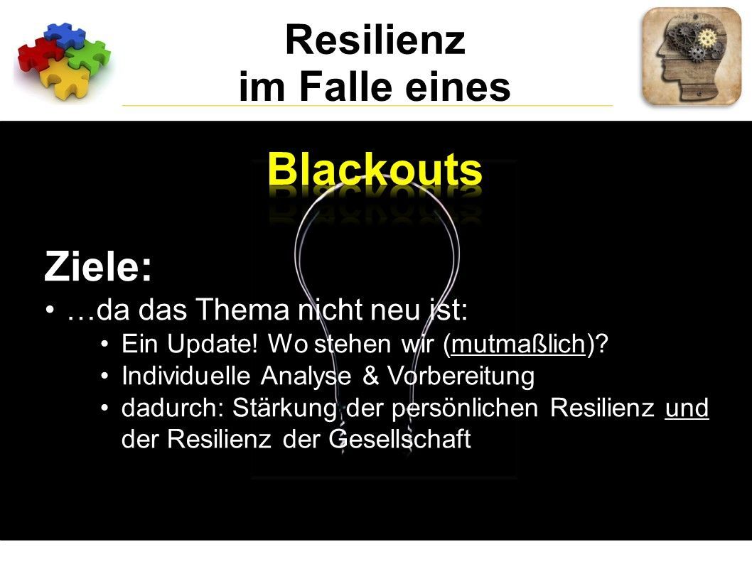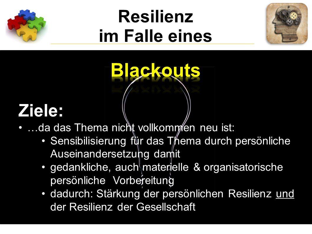 Also, eine angemessene Vorbereitung auf einen solchen Fall wurde empfohlen, so wie man sich auch sonst wie selbstverständlich z.B. durch Abschluss von Versicherungen vor Situationen schützt, von denen man hofft, dass diese nie eintreten. Mit der Versicherung aber wird man wesentlich gelassener bleiben, wenn es geschieht. Die Wahrscheinlichkeit in Angst oder gar Panik zu verfallen sei immens geringer. Man ist resilienter, widerstandsfähiger gegenüber und in der ungewöhnlichen Situation. Und schaffe man es, dass große Teile der Gesellschaft, möglichst alle Menschen, entsprechend organisatorisch und z.T. materiell auf eine solche Situation vorbereitet sind, dann ist nicht nur die Einzelperson, sondern die Gesellschaft resilienter. Der Strom bleibt weg, die Menschen bleiben gelassen. Der Gefahr, dass eine Panik ausbreche, sei dadurch weitestgehend vorgebeugt!