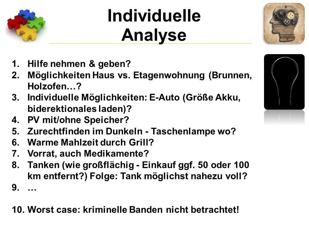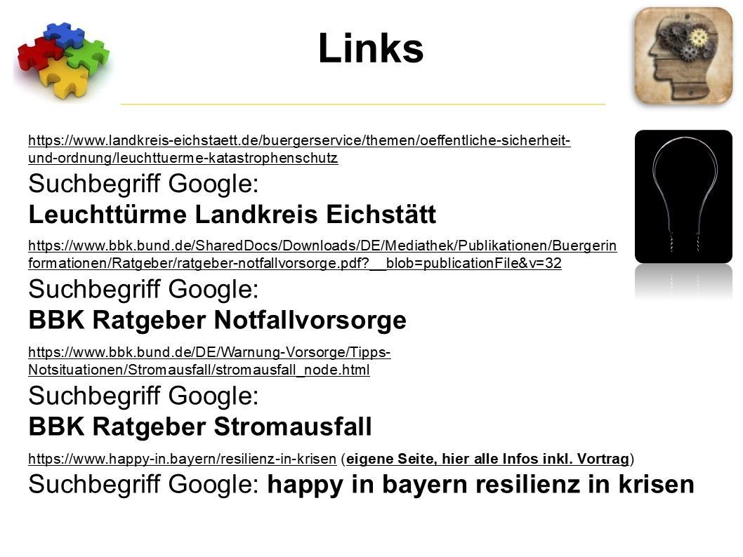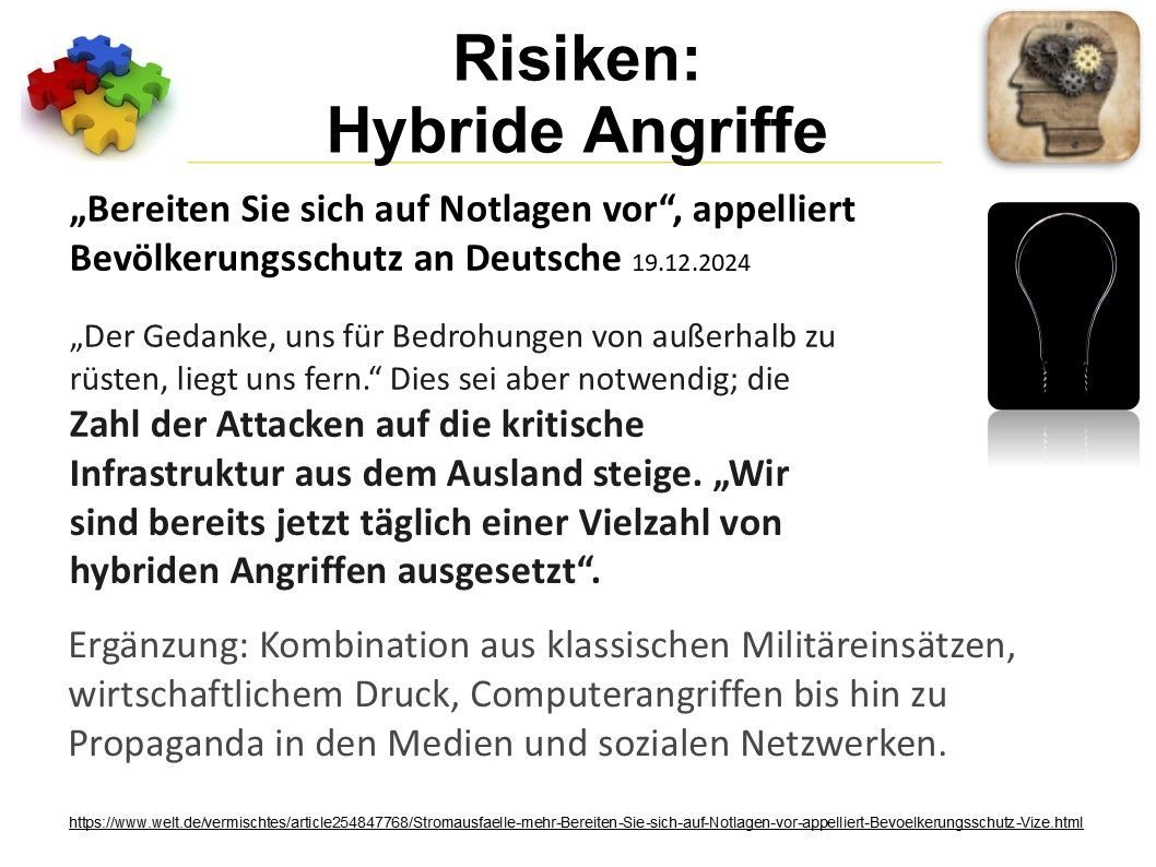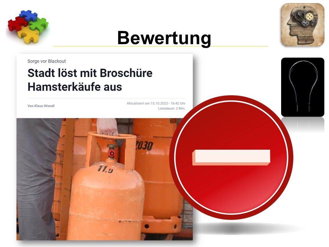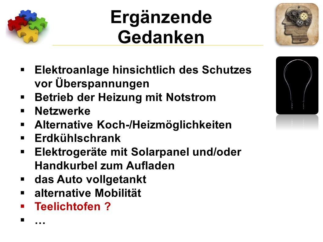 Also, eine angemessene Vorbereitung auf einen solchen Fall wurde empfohlen, so wie man sich auch sonst wie selbstverständlich z.B. durch Abschluss von Versicherungen vor Situationen schützt, von denen man hofft, dass diese nie eintreten. Mit der Versicherung aber wird man wesentlich gelassener bleiben, wenn es geschieht. Die Wahrscheinlichkeit in Angst oder gar Panik zu verfallen sei immens geringer. Man ist resilienter, widerstandsfähiger gegenüber und in der ungewöhnlichen Situation. Und schaffe man es, dass große Teile der Gesellschaft, möglichst alle Menschen, entsprechend organisatorisch und z.T. materiell auf eine solche Situation vorbereitet sind, dann ist nicht nur die Einzelperson, sondern die Gesellschaft resilienter. Der Strom bleibt weg, die Menschen bleiben gelassen. Der Gefahr, dass eine Panik ausbreche, sei dadurch weitestgehend vorgebeugt!