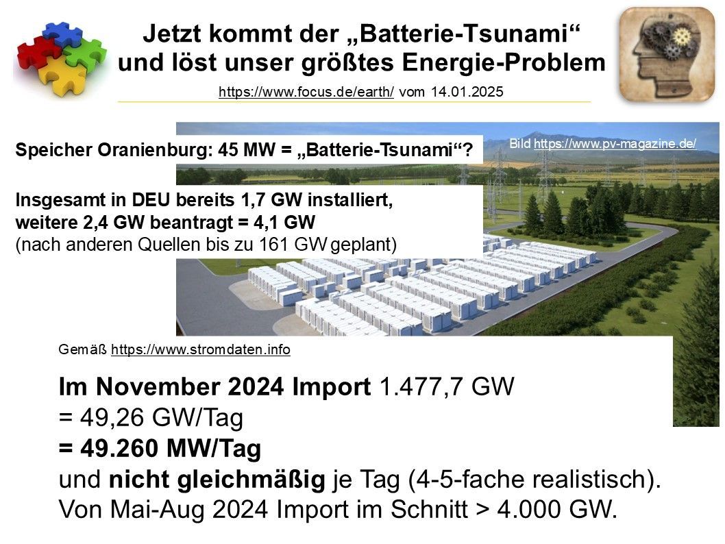 Und bereits hier die ersten beiden Ergänzungen vom 03.02.2025. Zunächst eine Folie zu den Speicherkapazitäten ergänzt. Hierzu ist es leider nicht einfach eine wirklich zuverlässige Angabe zu bekommen. U.a. bisher die aus einer Focus-Ausgabe von Januar dieses Jahres und hier ergänzt um die Aussage aus dem Donaukurier vom 01.02.2025 - Quelle selbst herausgesucht, da im Donaukurier leider nur der Hinweis auf den Bundesverband Solarwirtschaft: https://www.solarwirtschaft.de/2025/01/31/speicherkapazitaeten-2024-um-50-prozent-gewachsen/