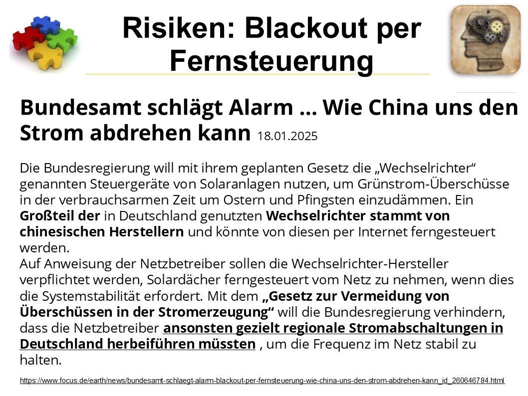 Dazu in Ergänzung der Hinweis auf einen Bericht auf YouTube vom 30.01.2025 zum Blackout in Irland vom 24.01.2025, der zumindest am 30.01.2025 noch immer angehalten hat und über den in unseren Medien fast gar nicht berichtet worden ist. Betroffen ursprünglich über 700.000 Haushalte, nach 5 Tagen noch immer deutlich über 100.000 Hasuhalte, und einzelne werden noch bis voraussichtlich zum 5. Februar, also dann insgesamt 12 Tage lang, betroffen sein. Hier geht es zum Video: https://www.youtube.com/watch?v=rS_Bctp1y7Y&t=2s