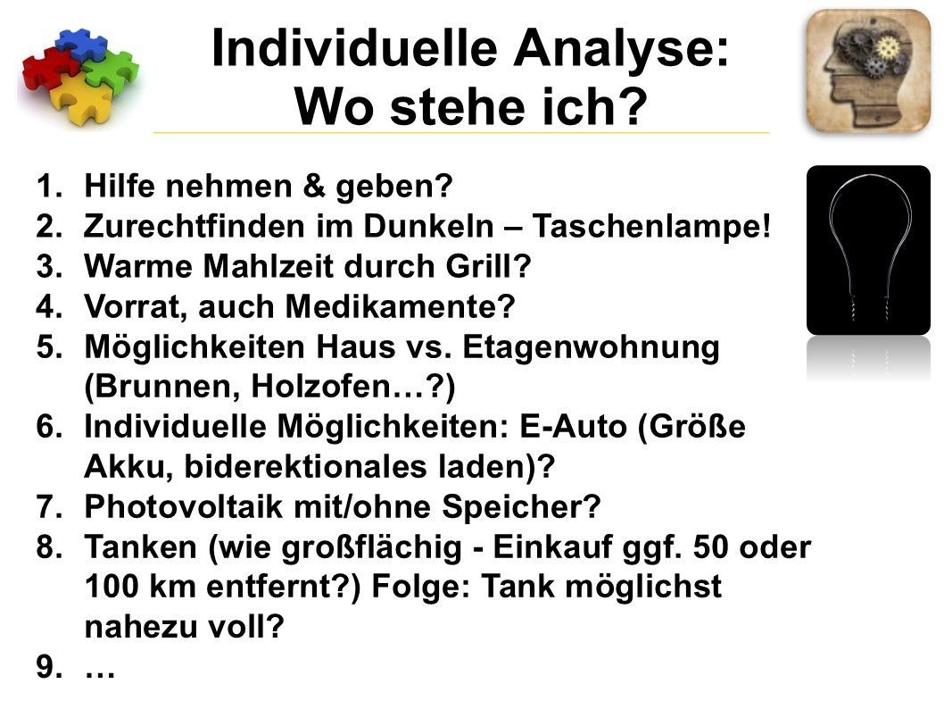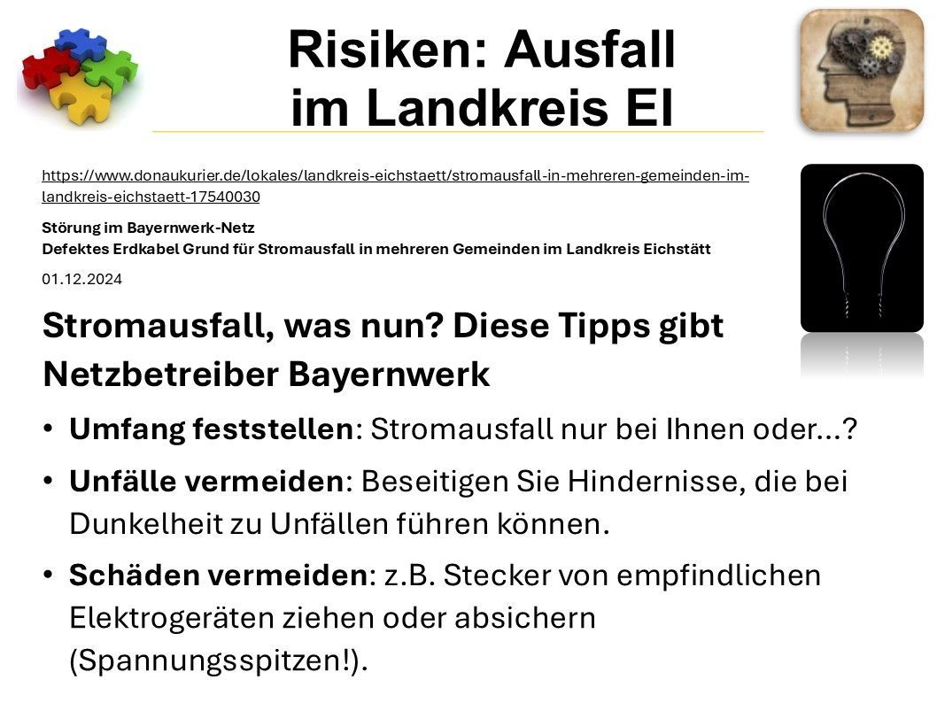 Meine Botschaft war, dass eine unbestimmte Wahrscheinlichkeit bestehe. Anhand der Annahme, dass in Ingolstadt und den umliegenden Landkreisen für 48 Stunden der Strom ausfalle, empfahl ich eine individuelle Analyse der persönlichen Situation zu machen, sich Fragen danach zu stellen, was das für einen persönlich, anhand z.B. der eigenen Wohnsituation, bedeute. Kann ich dann noch einkaufen? Funktioniert meine Heizung noch? Ist es möglich eine Rettungsleitstelle anzurufen? Kann ich mein Auto noch volltanken und einfach zu Freunden oder Verwandten fahren, die keinen Stromausfall haben? Oder auch: Wie finde ich mich jetzt im Dunkeln in meiner Wohnung/meinem Haus zurecht, wenn die normale Beleuchtung nicht funktioniert?