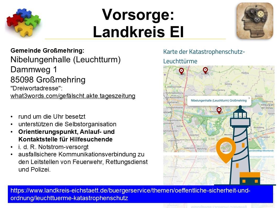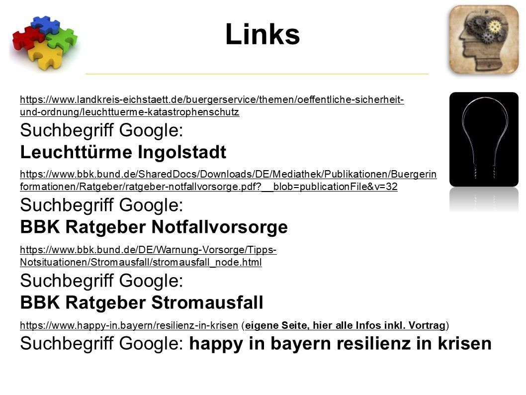 Daraus resultierend solle man ermitteln, wo überhaupt ein Vorbereitungsaufwand bestehe, damit man sich im Falle eines etwas längeren Stromausfalls prinzipiell entspannt zurücklehnen und diesen abwarten könne, ohne dass einem etwas Wesentliches – wie z.B. Trinkwasser oder Medikamente – fehle. Was also kann ich nun ohne großen Aufwand machen, um dennoch ruhig und gelassen zu bleiben? Als Basis für die persönliche Analyse und Vorsorge empfehle ich unverändert im Wesentlichen den entsprechenden Ratgeber für Notfallvorsorge des Bundesamtes für Bevölkerungsschutz und Katastrophenhilfe. Ergänzend habe ich auf das Konzept der Stadt Ingolstadt mit den Katastrophenschutz-Leuchttürmen hingewiesen, die über das gesamte Stadtgebiet verteilt sind und für einen solchen Fall aktiviert werden können. (Anm.: Durch Suchbegriffe wie „Notfallratgeber Bundesamt“ oder „Leuchttürme Ingolstadt“ findet man entsprechende Ratgeber unkompliziert und schnell im Internet.) „Bitte keine Hamsterkäufe!“, lautete der Appell, denn nahezu alles, was man dann benötige, sei bereits vorhanden.