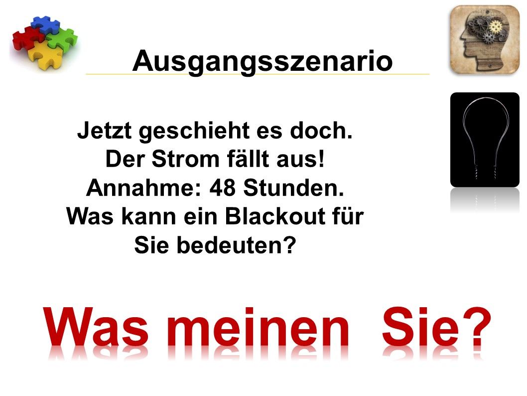 Im Falle eines Blackouts, also eines längeren flächendeckenden Stromausfalls, passieren viele Dinge auf einmal: Das Licht geht aus. Ampeln und Straßenbeleuchtung bleiben dunkel. An Tankstellen fallen die Pumpen aus, Fahrstühle bleiben stecken, Kassensysteme und Geldautomaten verweigern den Dienst, das Telefon ist tot und das Mobilfunknetz bricht zusammen.